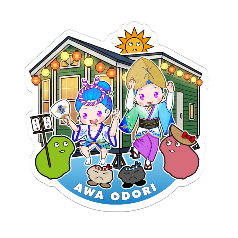 可愛い書き下ろしのミニアオち、踊る阿呆に扮したナウルくんたち、提灯をつけたトレーラーハウスが阿波踊りムードたっぷりです!